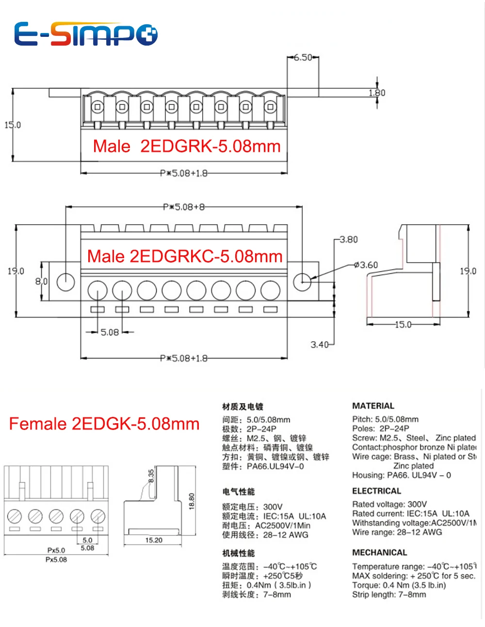 10Pairs Female Male Aerial Butt Welding With Lock 2Edgk 15Edgrkc-5.08Mm 2P-24P Plugin Solder-Free Wire Terminal Block Connector
