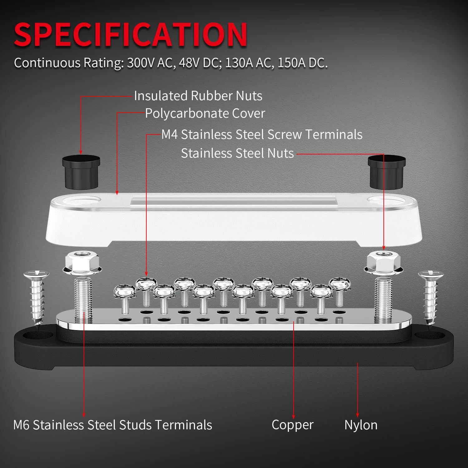 Terminals & Rating- Each Bus Bar Battery Terminal Block Includes – 2 X M6 (1/4″)Terminal Studs, 12 X M4 (8) Terminal Screws. Can Handle Voltage Max 300V Ac, 48V Dc, And Continous Amperage Max 130A Ac, 150A Dc.